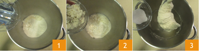 Para preparar la pizza con masa madre, primero haced la masa. En un bol de la batidora con gancho, verted la harina, el agua a temperatura ambiente 1 y la masa madre, también a temperatura ambiente 2. Trabajad con el gancho a baja velocidad hasta obtener una mezcla lisa y homogénea. Añadid luego la sal a la masa 3