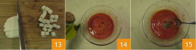 Mientras tanto, preparad la cobertura: cortad la mozzarella en cubos de 1 cm 13 y guardad en el frigorífico. Verted el puré de tomate en un bol: añadid la sal, un chorrito de aceite 14, un poco de orégano seco 15 y mezclad.