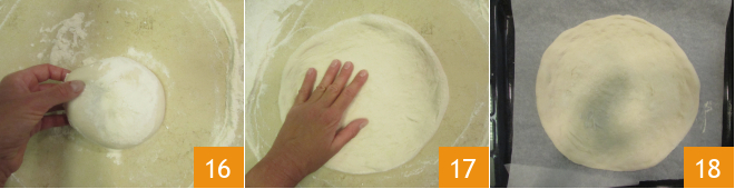 Tomad uno de los panecillos y trasladadlo a una superficie bien enharinada 16. Aplastad el panecillo con los dedos en el centro, luego, con cuidado, dadle vueltas con las manos en la superficie para formar el borde. Extendedlo de manera que en la parte central quede más delgado que el borde 17. Trasladadlo a una bandeja cubierta con papel de horno 18, o bien enharinada,