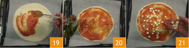 Utilizando una cuchara, extendid un poco de puré por toda la superficie, dejando limpio el borde 19. Añadid un chorrito de aceite 20 y los cubos de mozzarella 21.