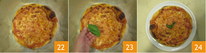 Coced en horno estático precalentado a 250°C durante 10 minutos, en la bandeja superior. Sacad la pizza del horno 22, añadid una hoja de albahaca 23 y servid de inmediato 24!