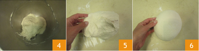y trabajad durante unos 5 minutos más 4. Transferid la masa a la superficie de trabajo ligeramente enharinada 5 y formad una bola rápidamente, para obtener una forma esférica 6.
