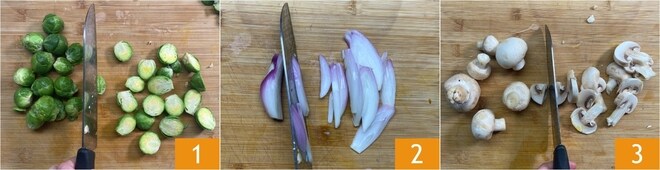 Para preparar la pizza de polenta, lo primero que hay que hacer es preparar las verduras: limpiad las coles de Bruselas y partidlas por la mitad 1, luego pelad la chalota y cortadla en rodajas finas 2. Quitad la base terrosa de los champiñones y cortadlos también en láminas 3.