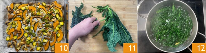 Distribuid las verduras en una bandeja de horno forrada con papel de horno y hornead en un horno estático precalentado a 220° durante 20-25 minutos 10. Mientras tanto, preparad la crema de col rizada: eliminad la parte central de las hojas de col rizada 11 y luego escaldadlas durante 3-4 minutos 12.