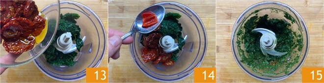 Escurrid la col rizada y pasadla a una batidora, luego añadid los tomates secos con su aceite 13 y el chile 14. Triturad hasta obtener una consistencia cremosa y reservad 15. Cortad la mozzarella en rodajas y ponedla en un colador para escurrir el exceso de agua.