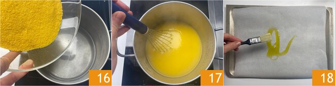 Para preparar la polenta, llevad a ebullición una olla de agua con 3 cucharaditas de sal, luego verted la harina en forma de lluvia 16. Cocinad durante el tiempo indicado en el paquete, revolviendo con el batidor de varillas 17. Engrasad una bandeja de horno forrada con papel de horno con aceite 18.