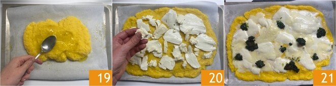Una vez lista, verted la mitad de la polenta sobre la bandeja (la cantidad es para 2 bandejas) y alisadla con el dorso de una cuchara, si es necesario ayudándoos con un poco de aceite 19. Condimentad la superficie con la mitad de la mozzarella en rodajas y la mitad del taleggio en trozos 20, luego añadid unos montoncitos de crema de col rizada. Hornead a 210° en modo estático durante 10 minutos, luego sacad del horno y dejad reposar unos minutos. Pasad al modo grill y hornead nuevamente durante 2 minutos para gratinar el queso 21.