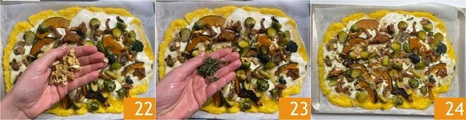 En este punto, sacad del horno y distribuid la mitad de las verduras, luego adornad con las nueces 22 y el tomillo 23. Volved a poner la bandeja bajo el grill durante 3-5 minutos, luego completad con una pizca de pimienta. Proceded de la misma manera para preparar también la segunda bandeja y servid vuestra pizza de polenta aún caliente 24.