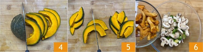 Lavad la calabaza y cortadla en rodajas finas, sin pelarla 4, luego dividid las rodajas por la mitad 5. Reunid todos los ingredientes en un bol y añadid también los rebozuelos, que habréis limpiado cuidadosamente con un paño húmedo 6.