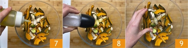 Condimentad con aceite 7, sal 8 y pimienta, luego mezclad masajeando todo con las manos 9.