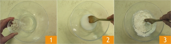 Para preparar la pizza de sémola comenzad con el pre-fermento, es decir, el poolish. Verted en un bowl el agua y añadid la levadura fresca 1. Disolvedla mezclando 2, luego añadid la harina de fuerza y mezclad 3 hasta obtener una mezcla homogénea.