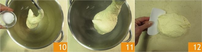 Añadid luego la sal 10 y trabajad durante unos 5 minutos más, hasta que esté bien absorbida 11. El bowl debe quedar limpio y la masa integrada. Apagad la máquina y humedeced las manos para desprender la masa del gancho suavemente. Trasladad luego la mezcla a una superficie, ayudándoos con una espátula 12.