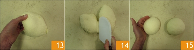 Dadle un par de pliegues a la masa 13, luego dividid la mezcla por la mitad 14 y formad dos esferas 15 sin añadir harina, utilizando siempre la espátula.