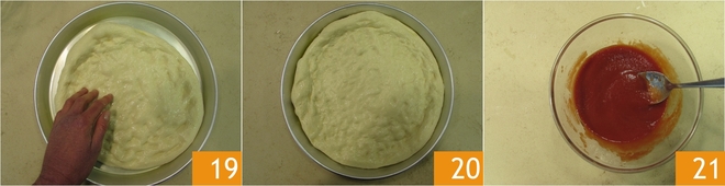 Extended la masa con las manos ligeramente engrasadas, comenzando desde el centro 19, para llenar toda la bandeja y tener un borde más grueso. Si la masa tiende a encogerse, dejadla reposar unos minutos y volved a estirarla. Dejad fermentar las 2 pizzas durante una hora más 20. Condimentad el puré de tomate con sal y aceite 21.