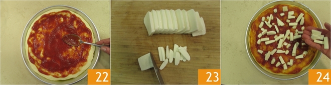 Usadlo luego para condimentar la superficie de la pizza 22 y hornead en horno estático precalentado a 220° durante 10 minutos en la rejilla más baja. Mientras tanto, cortad la mozzarella en tiras 22. Sacad la pizza del horno, añadid la mozzarella y hornead nuevamente durante otros 10 minutos.