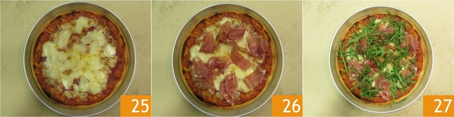 Cuando la mozzarella esté derretida, sacad la pizza de sémola del horno 25, condimentad con jamón serrano 26 y rúcula 27. Servidla todavía caliente y mientras tanto cocinad la segunda pizza!