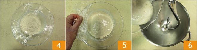 Cubrid con film transparente 4 y dejad fermentar durante 2 horas. Pasado este tiempo, retomad el poolish 5 y trasladadlo al bowl de una batidora con gancho 6.
