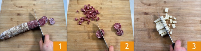 Para preparar la pizza de tallarines, comienza con el salami, quítale la piel y córtalo primero en rodajas 1 y luego en cubos de aproximadamente 1,5 cm 2. Haz lo mismo con el provolone 3.