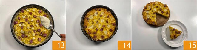 Nivela la mezcla y añade encima los cubos de salami y queso restantes. Espolvorea con el Parmigiano Reggiano DOP rallado 13. Cocina en horno estático precalentado a 200° durante unos 20-30 minutos. Si es necesario, activa el grill durante unos minutos para dorar aún más la superficie. Saca del horno 14 y sirve tu pizza de tallarines caliente o a temperatura ambiente 15!