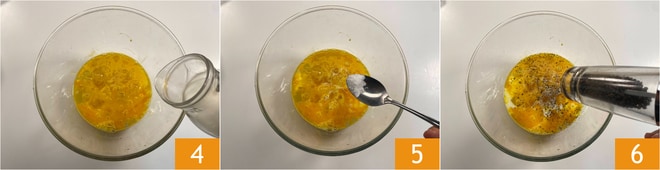 En un bol, bate los huevos, luego agrega la leche 4, sala 5 y añade pimienta 6.