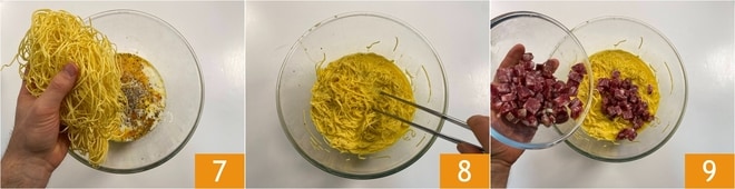 Agrega los tallarines 7 y mezcla delicadamente con las pinzas 8. Añade el salami en cubos, reservando algunos trozos aparte 9.