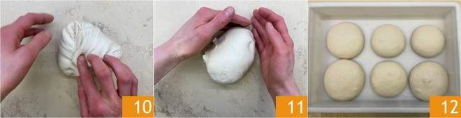 Tomad cada una de estas piezas y estirad los bordes desde el exterior hacia el centro 10, luego formad bolas 11. Colocad las bolas en una caja de fermentación, cerrad con tapa y dejad fermentar durante 6-8 horas a una temperatura de aproximadamente 18°-24° 12.