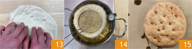 Transcurrido el tiempo de fermentación, extendéd las bolas en la superficie de trabajo ligeramente enharinada, aplastándolas ligeramente con las yemas de los dedos y tocándolas lo menos posible; deberéis formar un disco de aproximadamente 22 cm de diámetro 13. Freídlas luego en aceite de semillas a 180° 14; para una cocción uniforme, verted el aceite caliente sobre la superficie de la pizza ayudándoos con un cucharón. Freíd por unos 5-7 minutos dándoles la vuelta a mitad de cocción. A medida que se cocinen, transferid las pizzas fritas a papel absorbente para eliminar el exceso de aceite 15.