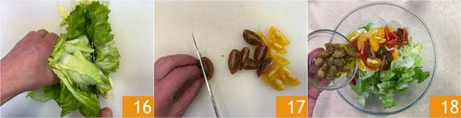 Mientras tanto, preparad el relleno: cortad en trozos la escarola rizada 16 y en cuartos los tomates cherry 17. Ponedlos en un bol y añadid las aceitunas 18.