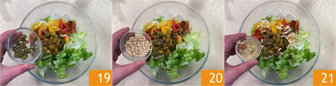 Agregad las alcaparras 19, los piñones 20 y la colatura de anchoas 21.