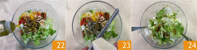 Verted el aceite 22, añadid el pecorino rallado 23 y mezclad todo 24.