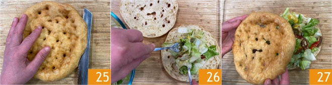 Dividid las pizzas por la mitad 25 y rellenadlas con el relleno 26. Finalmente, pasad las pizzas rellenas al horno a 200° durante 4-5 minutos. ¡Vuestra pizza frita con escarola está lista para ser degustada 27!