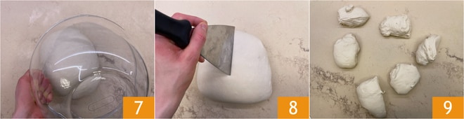 Cubrid el bloque de masa con el bol 7 y dejad reposar en la superficie de trabajo de 15 a 40 minutos. En este punto, dividid la masa en 6 piezas de 280 g cada una 8 9.