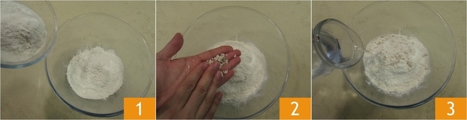 Para preparar la masa para la pizza hemos elegido amasar todo a mano, pero si preferís utilizar la amasadora podréis seguir los mismos procedimientos, usando el gancho a velocidad media-baja. Como primera cosa verted las harinas en un bol 1, luego desmenuzad la levadura en su interior 2 y verted el agua poco a poco 3. La temperatura ideal del agua es de 25°.