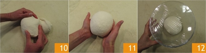 Una vez hechos los 4 pliegues girándola sobre sí misma 10 dadle la forma de una esfera 11. Transferid la masa así formada en un bol, cubrid con película transparente y dejad levar 12. Para comodidad podéis poner el bol en el horno apagado pero con la luz encendida, así el interior alcanzará la temperatura de 26°-28°, ideal para la levadura; alternativamente, podéis también mantener el recipiente en un lugar cálido. Los tiempos son aproximados ya que cada masa, la temperatura y las condiciones meteorológicas influyen en la levadura: en promedio la masa debería tardar 6 horas en duplicar su volumen.