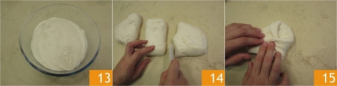 Pasado el tiempo de levado, la masa estará bien hinchada 13, luego transferidla a la superficie de trabajo y divididla con un cortador en 3 piezas de 265 g 14. Si es necesario, podéis enharinar ligeramente la superficie de trabajo. Ahora, tomad cada porción y, como hicisteis anteriormente, levantad un borde de la masa y llevadlo hacia el interior. Repetid la misma operación para los otros 3 bordes de masa 15.