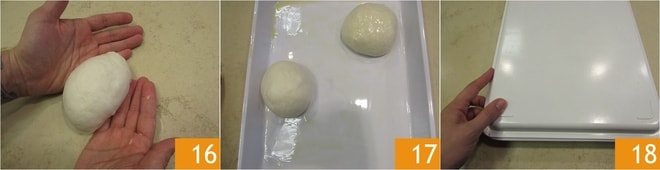 Voltead la masa y proceded con el boleo: bolear la masa significa girarla con las manos en la superficie de trabajo llevándola hacia vosotros y luego alejándola repetidamente hasta obtener una esfera lisa y regular 17. Transferid cada vez las bolas a una caja para pizza previamente engrasada 17 y cubrid con su tapa 18.