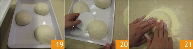 Dejad reposar otros 30 minutos 24. Mientras tanto, colocad en el horno la piedra refractaria, colocadla en alto. Encended el horno llevando la temperatura a 250° y activando el modo estático. Ahora utilizando un cortador levantad delicadamente la primera bola 20. Transferidla a una superficie con abundante sémola y añadid un poco más de sémola en la superficie. Con la punta de los dedos, aplastad la bola en el centro 21.