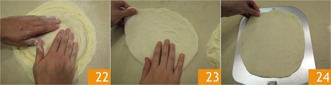 Continuad de esta manera haciendo un movimiento rotatorio para extender la masa 22. No aplastéis nunca los bordes, y continuad hasta obtener un disco de 28 cm de diámetro 23. Transferid la masa a la pala, teniendo cuidado de no dañarla 24.