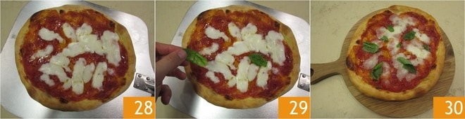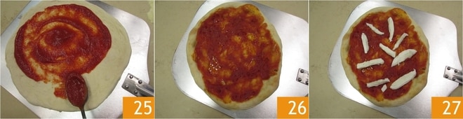 Ahora, ayudándoos con una cuchara, extendid la salsa de tomate sobre la pizza, dejando el borde libre 25. Hornead, deslizando delicadamente la pizza sobre la piedra refractaria y dejad cocer durante unos 6 minutos. Mientras tanto, cortad la mozzarella en palitos 26 o desmenuzádla con las manos. Podéis exprimirla suavemente para que no suelte demasiada agua durante la cocción 26. Pasados los 6 minutos, usando siempre la pala, sacad la pizza del horno 27.