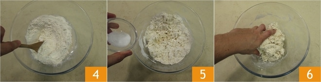 Mezclad poco a poco con una cuchara de madera 4 y cuando hayáis añadido casi toda el agua, añadid también la sal 5. Continuad vertiendo el agua y comenzad a amasar con las manos, para amalgamar los ingredientes 6.