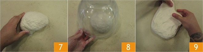 Finalmente, transferid la masa a la superficie de trabajo y trabajadla con las manos hasta que esté lisa y homogénea 7. En este punto, dejadla reposar sobre la superficie de trabajo durante unos diez minutos cubriéndola con el bol 8. Una vez reposada, dadle un pequeño pliegue: imaginad que la esfera está dividida en 4 partes, tomad el extremo de cada una, tirad suavemente y plegad hacia el centro 9.