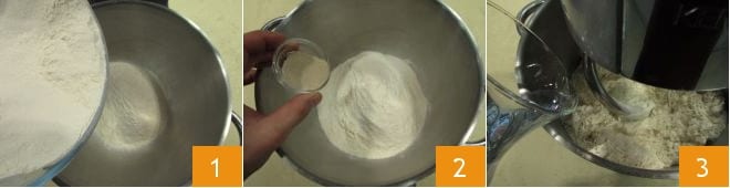 Para preparar la masa de la pizza, empieza vertiendo la harina en el bol del robot de cocina 1. Añade la levadura 2 y 100 gramos de agua, luego pon en marcha el robot con el gancho montado a velocidad media-baja 3.