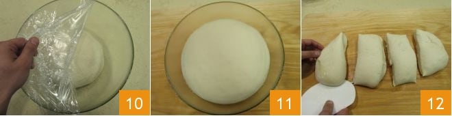 Cubre con film transparente o un paño limpio y deja leudar en el horno con la luz encendida 10. Espera a que la masa haya al menos duplicado su volumen (1,5 h), mejor si triplicado (2,5/3 h) y procede a extender las pizzas 11. Una vez que la masa haya leudado, transfiérela a la mesa de trabajo y divídela en 4 partes iguales 12.
