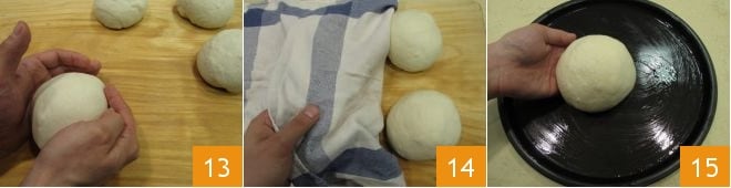 Haz con cada una de ellas pequeñas bolas 13. Cubre con un paño limpio y deja reposar por 30 minutos 14. Mientras tanto, engrasa ligeramente con un poco de aceite 4 bandejas de pizza de 30 cm de diámetro. Pasados los 30 minutos, coloca en el centro de la bandeja una bola de masa 15.