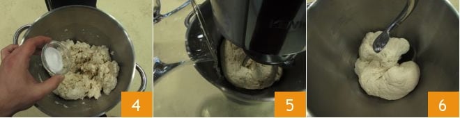 Continúa añadiendo el agua poco a poco, asegurándote de esperar que la cantidad anterior haya sido bien absorbida por la harina 4. Una vez vertidos aproximadamente 3/4 del agua, añade la sal 5 y sigue amasando. Añade el resto del agua siempre en hilo y deja trabajar hasta obtener una masa suave y homogénea 6.