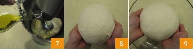 En este punto agrega el aceite gradualmente (como hiciste con el agua) 7. Cuando el aceite se haya absorbido completamente, saca la masa del robot de cocina y dale forma con las manos hasta obtener una bola 8. Colócala en un bol grande ligeramente engrasado 9.