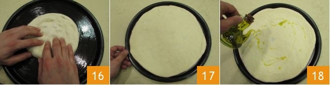y comienza a presionar desde el centro hacia el exterior, estirando ligeramente los lados si es necesario 16. Si la masa resulta demasiado elástica y tiende a regresar a su forma original, deja de lado la pizza que estás extendiendo y procede a extender otra, dejando reposar la anterior. Intenta extender la masa sobre toda la superficie de la bandeja 17. Vierte un poco de aceite sobre la pizza y procede a aderezarla 18.