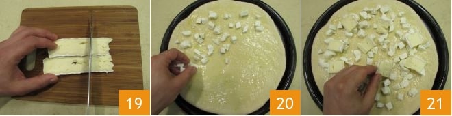 Corta el brie en rebanadas de poco más de 5 mm de grosor y luego corta en cuadritos de aproximadamente 2,5 cm de lado 19. En este punto, coloca la mozzarella triturada toscamente sobre la pizza 20 y añade el brie 21.