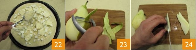 Por último, espolvorea con el parmesano 22 y hornea por 10 minutos a 200 °C. Mientras tanto, lava y pela las peras 23. Luego córtalas en 4, retira el corazón y corta rebanadas de igual grosor 24.