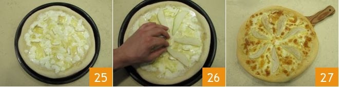 Pasados los 10 minutos, saca la pizza del horno 25 y coloca las peras en forma de abanico sobre la pizza 26 y hornea nuevamente por otros 10/15 minutos siempre a 200 °C. Tan pronto como saques la pizza de peras y brie del horno, sírvela inmediatamente 27.